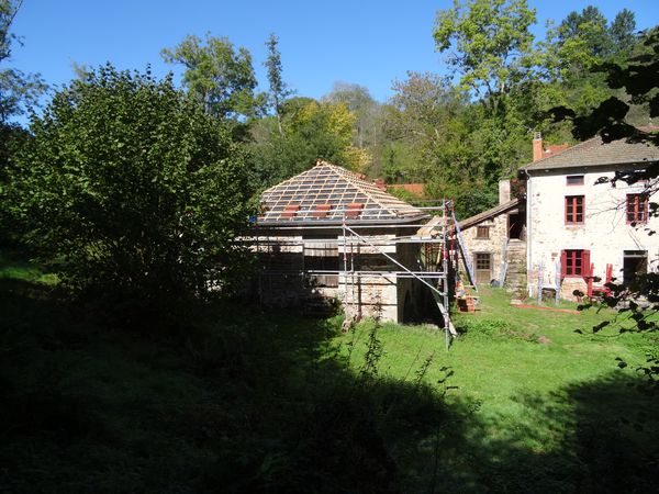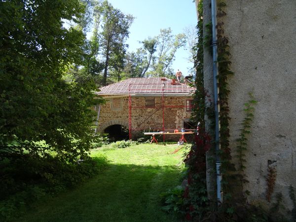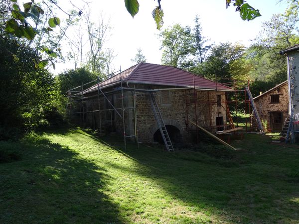 La pose du film pare-pluie, des liteaux, de la zinguerie et des tuiles a permis de mettre le bâtiment hors d'eau avant les grosses pluies. Il manque quelques éléments de faîtières et de tuyaux de descente. Un regard au coin du moulin sera raccordé à celui du coin du fournil. |