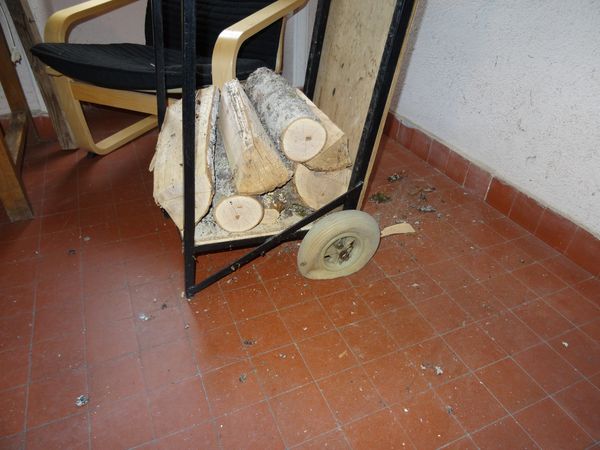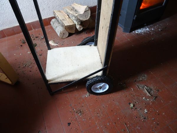 Un pneu du chariot porte bois a éclaté. Des roues de tondeuse ont été réalésées au diamètre 14. Ça roule mais pas très rond.
