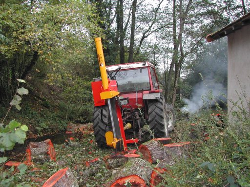 | L'élagueur est venu avec trois jours d'avance mais il n'a pas fini le travail. Les trois aulnes de la pointe et les deux frênes au dessus du béal étaient tronçonnés dès le lundi soir. La fendeuse à bois de Pierre Charrondière fut bienvenue. | ![]() |