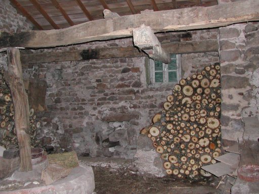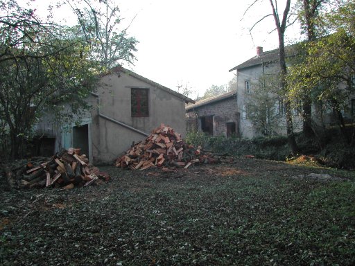 | Le bois de peuplier est rentré à droite au fond dans la seconde salle du moulin et le reste de bois de 99 a été transféré dans la remise de la grange pour dégager la place pour le bois de l'aulne et du frêne qui seront abattus près du pont. | ![]() |