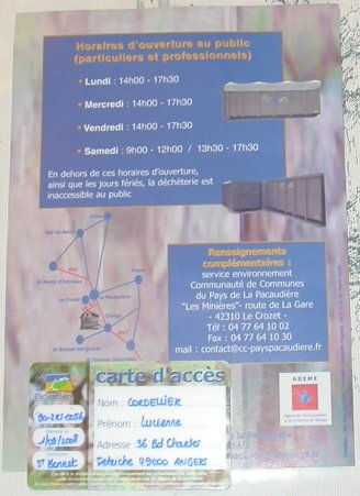 Nouvelles diverses La carte d'accès à la déchetterie de la Pacaudière (à la gare) est entreposée dans le tiroir de droite du buffet de la cuisine de la grande maison. Etant dans le périmètre de l'assainissement collectif, le Moulin Pinay n'est pas concerné par l'inspection des assainissements individuels. Il ne faut donc pas accepter cette inspection (payante) en invoquant ce motif. Le service d'inspection est censé se renseigner auprès de la mairie. |