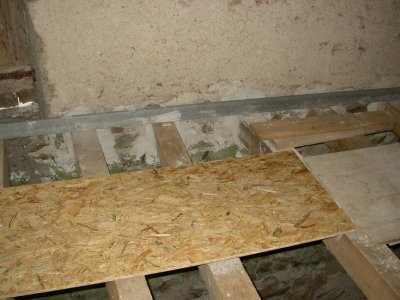 Une poutre supplémentaire a été remplacée et scellée au-dessus du passage de roue. Le callage est commencé. Des planches de calage entreposées sur place et allant de 3 à 26 mm d'épaisseur sont réservées à cet usage. Les dalles d'OCB de 16 mm semblent un peu minces à certains. Elles seront employées ailleurs et des dalles de 18 mm seront utilisées.