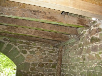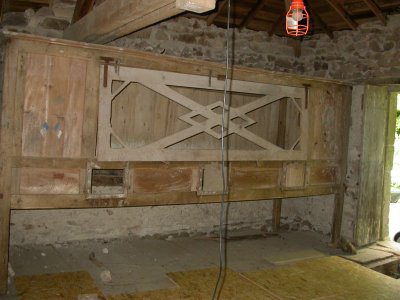Avant sa destruction l'ancien plancher doit être étayé pour supporter la migration du meuble. Une partie du nouveau plancher sera alors démontée, les vieilles poutres seront remplacées. Des planches entreposées sur place et allant de 3 à 26 mm d'épaisseur sont réservées au calage sur les poutres à poser. |