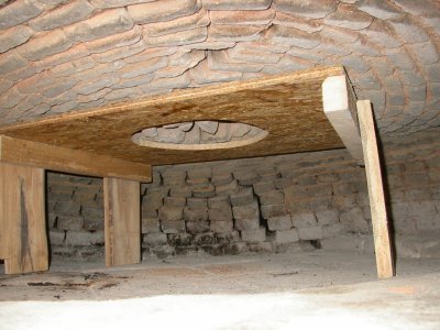 Pour éviter l'écrasement de l'opérateur un étayage a été monté dans le four. Il est donc important de ne pas allumer le four avant la réparation. Le mortier réfractaire a été acheté et il est stocké dans le placard du couloir de la grande maison. Il semble que la voûte soit faite de demi briques. Il faudra donc tronçonner à la demande celles qui sont sur l'appui de la fenêtre du fournil. Il est prévu d'utiliser l'étayage pour visser des baguettes horizontales destinées à maintenir les briques en place le temps de la prise du mortier. Ces travaux sont prévus dans la troisième semaine du mois de février si la température dans le fournil est supérieure à 5 °C. |
