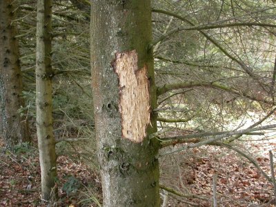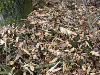 Il a été attaqué par les parasites eux-même pourchassés par un pic noir. Ce qui donne des copeaux de belle taille. Il faut prévoir de l'abattre (l'arbre pas le pic) mais il est coincé le long des fils du téléphone entre plusieurs autres arbres. Une affaire délicate ! |