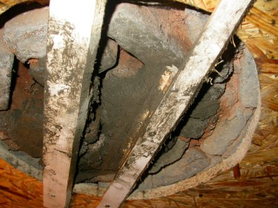 Les briques de voûte ont été scellées au mortier réfractaire. L'opération n'est pas tout à fait terminée car le chantier est assez pénible et incertain. Les briques ne restent pas spontanément au plafond ! Ce mortier doit sécher 15 jours avant de connaître une première chauffe (modérée). Il serait souhaitable de continuer la réparation aux vacances de printemps. Les briques mobiles des deux piedroits du four ont été rescellées avec beaucoup plus de facilités
