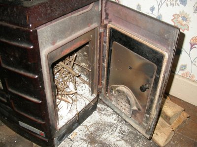 Le gond du poêle de la chambre aux deux fenêtres a été replacé. Le poêle ferme (avec du doigté) et chauffe dur car il y a des prises d'air incontrôlées. |