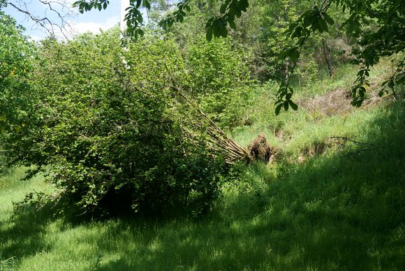Un coup de vent a déraciné le noisetier au dessus des lilas au bout du petit jardin.