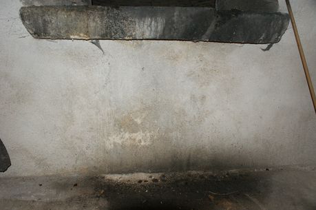 L'enduit à la chaux aérienne sous le four n'a pas résisté à l'humidité et à la chaleur. Il est soufflé et écaillé. Un enduit à la chaux hydraulique sera posé quand le chapeau aura été mis en place sur le cheminée du fournil. |