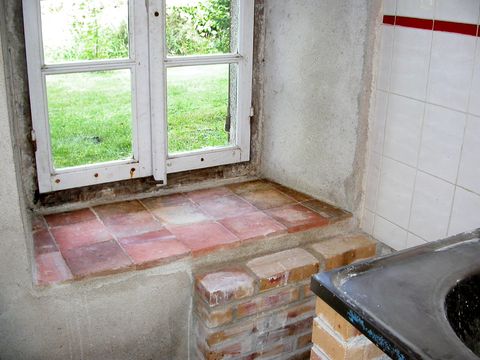 L' appuis intérieur de la fenêtre et celui du passe-plats ont été carrelés avec des carreaux de récupération posés à la chaux. Les murets de briques ont été déposés sauf celui au pied de la fenêtre et les briques stockées dans la pièce à côté du garage vert de la vieille maison. |