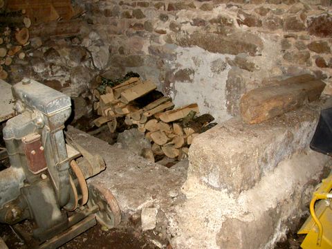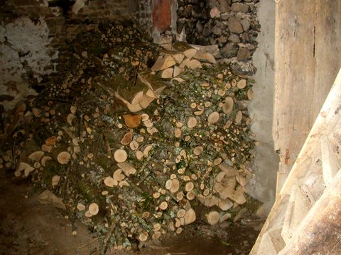 Il a produit une grande quantité de bois qui est maintenant stocké le long du mur nord de la deuxième salle du moulin. Un nouveau lieu de rangement a été ouvert devant le mur ouest de cette salle. |