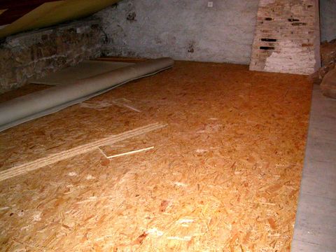 | Le plancher de la soupente au dessus du fournil a été doublé avec des panneaux d'OSB bouvetés de 12 mm d'épaisseur. Le chantier n'est pas complètement fini mais il est approvisionné. Des congés de mortier viendront finir l'étanchéité à la poussière le long des murs.