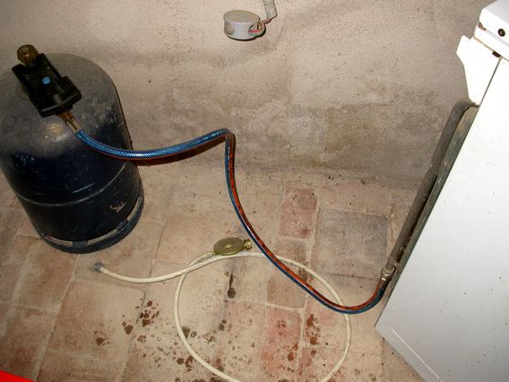 | Le tuyau de la gazinière de la souillarde de la vieille maison était périmé depuis 2003. Il a été remplacé par un tuyau permanent de récupération. Pour débrancher fermez la bouteille, appuyer sur le bouton bleue et tourner d'un tour en dévissant. Pour remonter faire l'inverse mais ne pas oublier d'appuyer ensuite sur le petit bouton de sécurité sous le détendeur. C'est indispensable pour avoir du gaz. | ![]() |