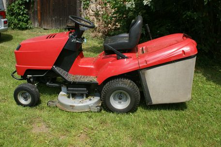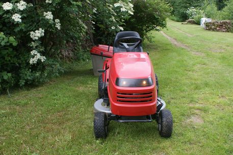 La nouvelle tondeuse qui permet de tondre la nuit est arrivée au moulin. C'est une hydrostatique ce qui oblige à faire très attention au début. Côté gauche pas de problème sauf que le réglage de hauteur de coupe est de ce côté. Les commandes des gaz et la clé de contact (étiquette bleue, même rangement que l'autre) fonctionnent de la même façon Côté droit, ça se corse. Relâcher le frein d'immobilisation avant de partir en avant ou en arrière. Avoir le pied léger sur l'embrayage hydrostatique. Dès que l'on cesse d'appuyer, la machine freine sec. |