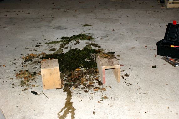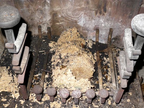 Le nid de frelons de la cheminée de la vielle maison est tombé et a été brûlé. |