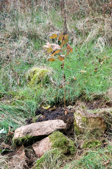 Un fuchsia a été planté au dessus du mur de soutènement, un marronnier dans le talus du chemin d'entrée (désolé pas de photo), un érable dans le coteau au bout du petit jardin et trois sorbiers dans la zone défrichée à la sortie du pont.