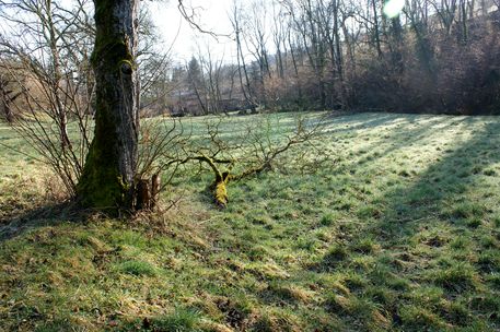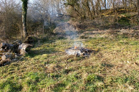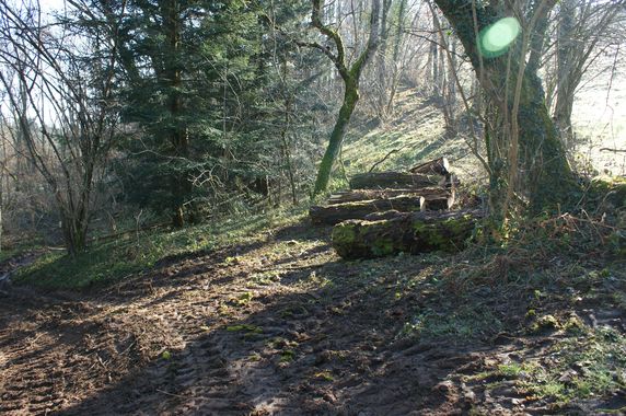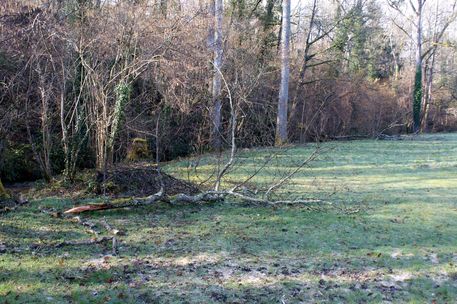 | Les abondantes chutes de neige lourde de novembre ayant cassé ou abattu de nombreux arbres, un noisetier et un chêne tombés dans le troisième pré ont été débités et rentrés en profitant de la possibilité d'amener une remorque routière sur place. Les menues branches ont été brûlées. . |