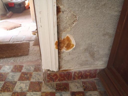 Les champignons ont encore fait des dégâts dans la vieille maison. Il s'agit de mérule ou pourriture carrée. Le xylophène étant inopérant sur ce genre de champignons un nouveau produit va être essayé (OCCI mérule). Ces produits sont difficiles à trouver. En attendant il faut éliminer les repousses systématiquement et laisser les portes sous l'escalier grandes ouvertes pour améliorer la ventilation du mur. Ce champignon ne supporte pas la sécheresse.