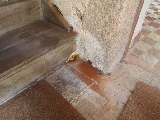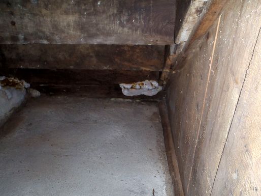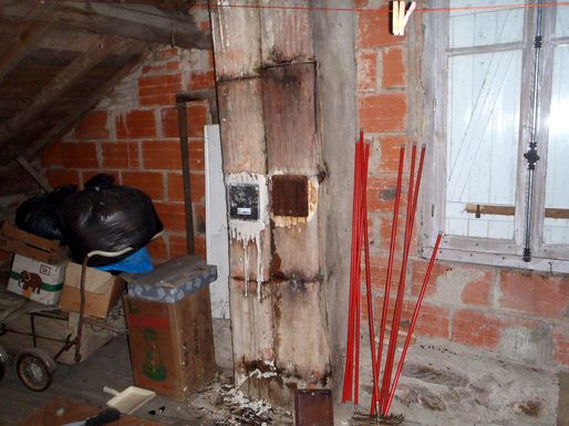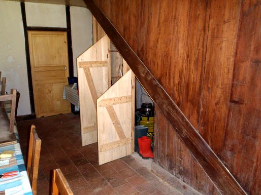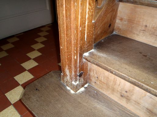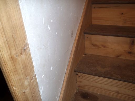 Un nid de guêpes s'étant installé dans la cheminée de la cuisine de la vieille maison, une occultation provisoire en carton a été montée. Sans doute à la faveur d'une année très humide l'activité des vrillettes a été intense dans les deux escaliers de la grande maison. Un traitement au xylophène a été réalisé sur les pièces les plus touchées. |