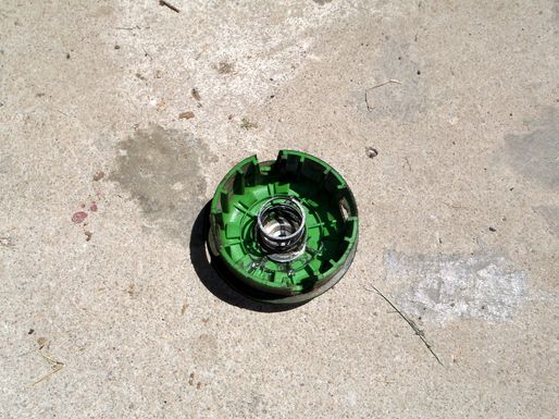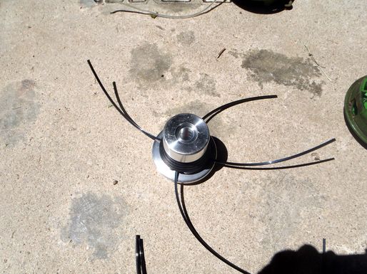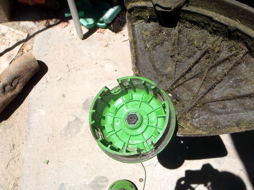 | La tête du porte-fil de la débroussailleuse ayant fondu suite à un mauvais montage. Une tête de remplacement a été trouvée. Le montage est un peu différent mais plus simple. Attention ! Le pas de vis étant inversé il faut "visser" pour la démonter.