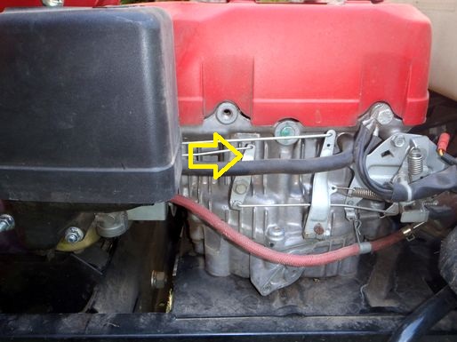 Un problème de starter est survenu, le levier marqué par la flèche ne revenant pas suffisamment en arrière. Il faut s'assurer aussitôt après le démarrage qu'il est bien positionné comme sur la photo (côté gauche de la machine). Une goutte d'huile a résolu le problème mais il peut se reproduire. Le danger de "rincer" le moteur est important. Il faut vérifier après chaque démarrage. |