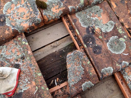 Une tuile brisée a provoqué une forte humidité au niveau du pied de la troisième ferme de la grange. Elle a été changée.