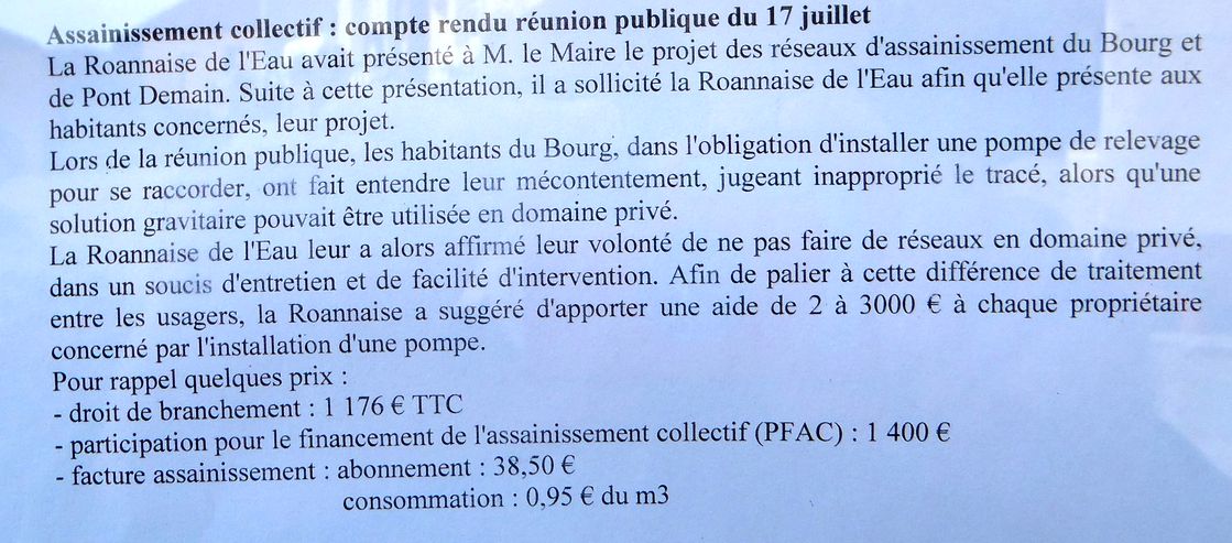 | La présentation du projet d'assainissement par la Roannaise de l'eau a donné lieu à des protestations véhémentes mais sans effets. Il a été indiqué que ceux pour qui les frais de connexion seraient déraisonnables, c'est à dire supérieurs à ceux d'un assainissement non collectif aux normes, le raccordement ne peut être imposé. Il faudrait alors mettre en oeuvre des assainissements individuels aux normes, c'est à dire fosses toutes-eaux et solutions compactes de post-traitement des effluents car la place manque pour mettre en place des filtres à sable. Au cas où la décision serait prise de se raccorder à l'assainissement collectif, les pompes pourraient être installées dans la cave ouest de la grande maison et dans la remise derrière la vieille maison. Cette solution facilite la maintenance sans occasionner d'odeurs car les dispositifs sont fermés par un couvercle étanche et munis d'un évent extérieur. Un rendez-vous a été pris avec le syndicat des eaux de la Teyssonne pour connaître le trajet exact de la conduite d'eau potable arrivant au compteur de la grande maison. Ceux qui veulent plus d'informations peuvent consulter ce site. Il dit globalement la même chose que les gens de la Roannaise de l'eau. |