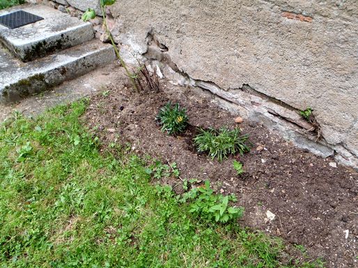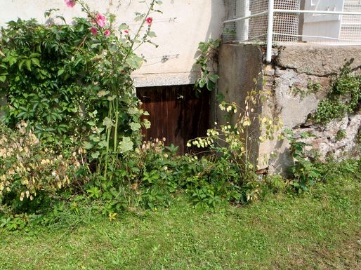| Des fleurs devant la cuisine de la vieille maison. |