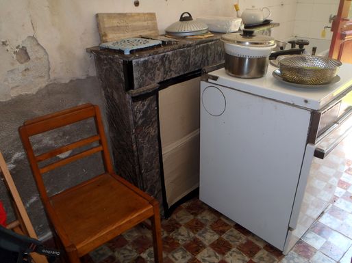 Il est envisagé de poser un plafond en frisette quand le problème sera réglé. Des trappes de visite seront ménagées pour l'accès aux conduites d'eau et d'électricité. Pour préparer ce travail un luminaire a été installé au dessus de l'évier. |