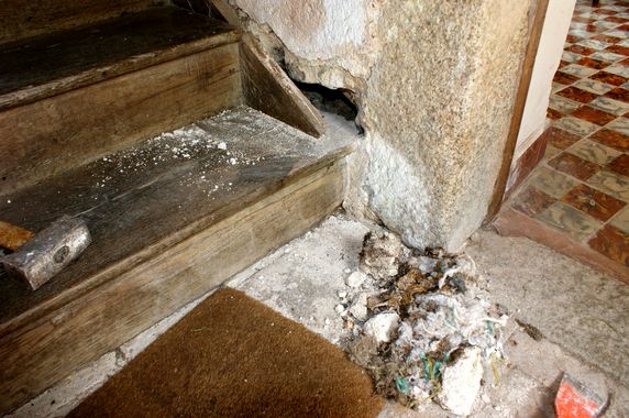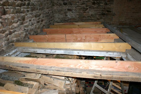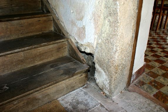 Pour éviter l'humidité stagnante la maçonnerie à droite de la première marche a été excavée. Des quantités importantes de champignons et un nid de loir ont éré retirés. La première marche a été recoupée pour qu'elle ne soit plus en contact avec le mur. Les maçonneries et les pièces de bois les plus exposées on été badigeonnées avec OCCI mérule. Selon le résultat la maçonnerie sera reprise et les bois détruits seront remplacés. Les modèles de moulure ont été gardés. |