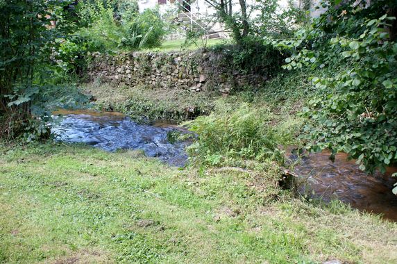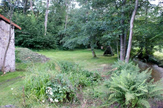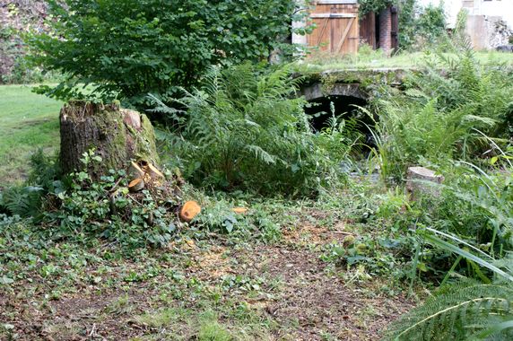 | Le bouquet d'aulnes entre la rivière et le moulin a été arasé. Le bois est rangé le long du mur est de la première salle du moulin. |