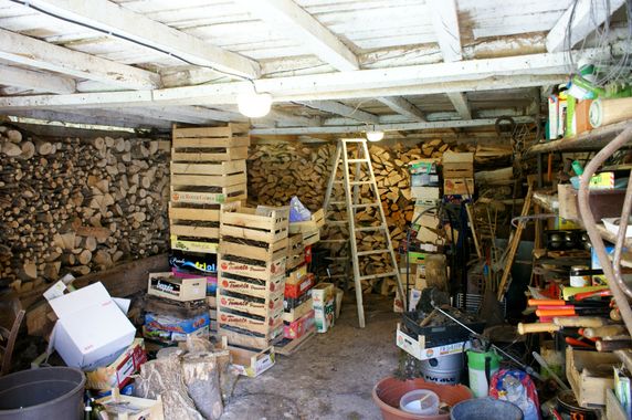 | Deux luminaires de cave ont été installés dans la remise. L'ancien éclairage a été mis hors service. Des solives sont en cours de pose dans la dernière travée du plafond de la remise. Malheureusement, la perceuse (30 ans d'âge) a rendu l'âme en cours de travail. Il n'y a plus de pièces détachées pour ce modèle.