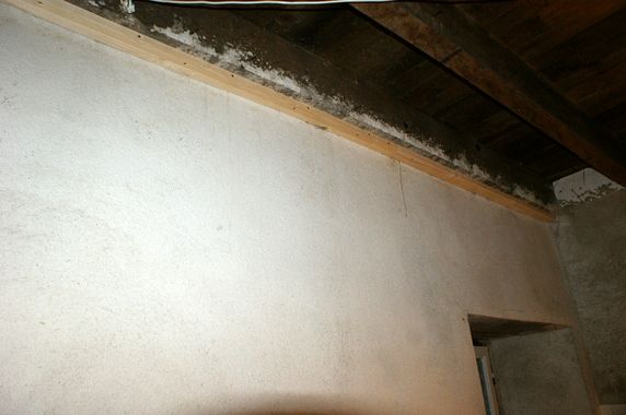 La lacune entre l'enduit et la poutre dans la souillarde de la vieille maison a comblée. Cela apporte un réel confort car les loirs faisaient tomber des quantités importantes de saletés. Le problème des fuites du bac à douche n'étant pas complètement résolu. La pose d'un plafond en lambris a été reportée à plus tard.