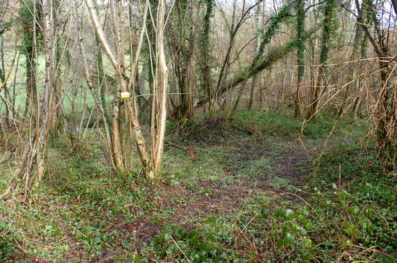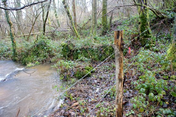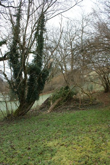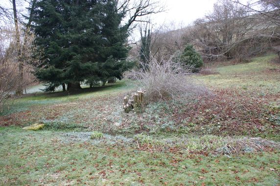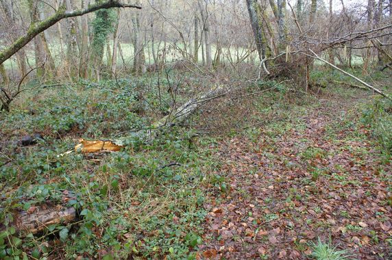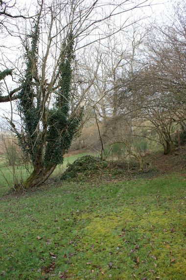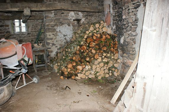 Comme observé sur les photos précédentes quelques arbres près de la vanne ont été rompus à mi hauteur par des bourrasques de l'hiver. C'est aussi le cas d'un saule dans le jardin. Ce saule très abîmé par des champignons a été débité. Le gros noisetier en bas du jardin a été recépé mais la présence d'un grillage pris dans la souche n'a pas permis de l'araser plus. Tout ce bois a été rangé dans la seconde salle du moulin le long du mur Nord.