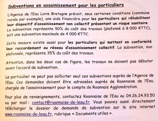 Le tabouret de branchement de l'assainissement a été posé à l'endroit prévu. La pompe de relevage publique est située juste en face. Le chemin du village a été bitumé. La station de traitement est terminée mais une partie du réseau en bas du village n'a pas encore été réalisée. Une note dans le journal municipal indique que notre installation de pompes de relevage pourrait être subventionnée.