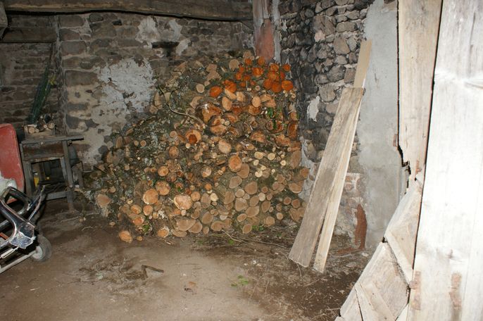 Un petit aulne qui menaçait les fils électriques près du muret a été abattu. Le bois a été rangé le long du mur Nord de la seconde salle du moulin. La réserve de petit bois a été réorganisée. Le bois à utiliser en priorité est celui du fond de la remise.