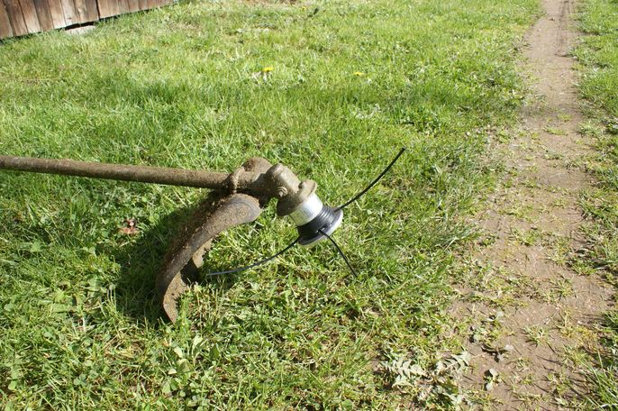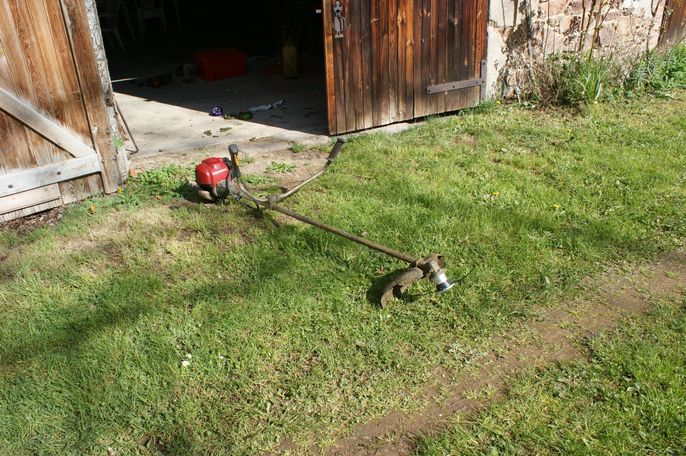 | La tête automatique de la débrousailleuse a perdu une pièce. Elle a été remplacée par une tête métallique qui permet de mettre en oeuvre deux tronçons de fil d'environ 40 cm. Pour les changer il faut enlever le plateau inférieur en vissant car le pas de vis est inversé.
