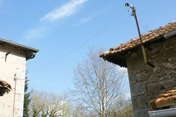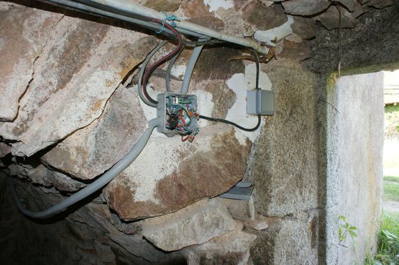 Les deux fils alimentant le moulin, depuis longtemps dénudés, ont été emmêlés par le vent, occasionnant un court-circuit. Ils ont été remplacés par un câble à trois conducteurs, résistant aux UV et enroulé sur un fil de fer tendu. A cette occasion la potence côté moulin a été simplifiée, une nouvelle boîte de dérivation installée dans le moulin et un luminaire à LED avec détecteur de présence branché sur la boîte. La détection de présence n'est pas parfaite mais supplée pour le moment à la panne affectant le bouton poussoir de la minuterie de la vielle maison. |