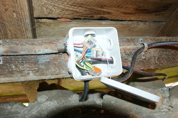 Dans la grande maison, une ligne partant du tableau électrique (disjoncteur bleu) correspond au futur circuit des caves et de la pompe de relevage. Elle aboutit pour l'instant aux deux dominos classiques de la boîte de dérivation à l'entrée de la cave ouest.
