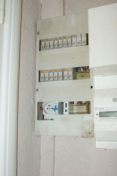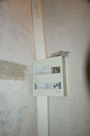 La ligne est raccordée sur le premier fusible en haut à gauche du tableau électrique de la vieille maison. Le nouveau disjoncteur en bas à droite correspond à la prise de courant sous l'escalier. L'identification des différents circuits est en cours. Les deux prises sud de la salle noire ne fonctionnent pas. Un circuit doit être dédié à la pompe de relevage de l'assainissement collectif. |
