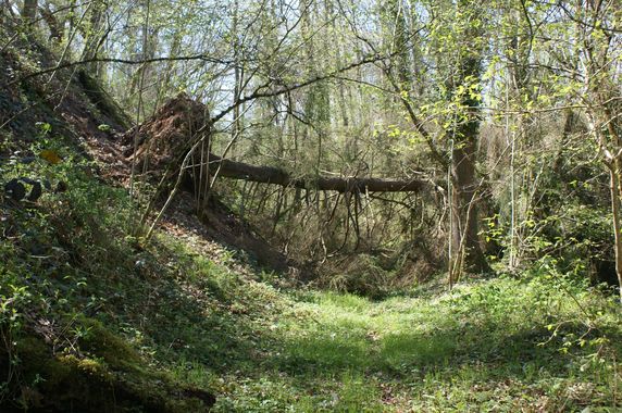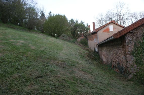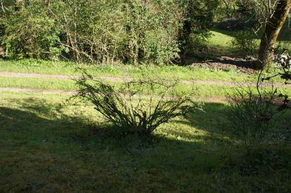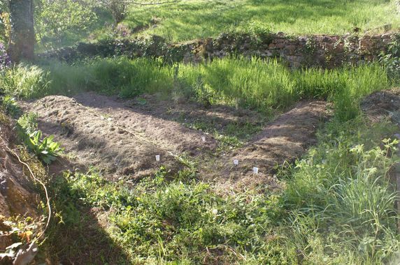 | Un épicéa est tombé en travers du béal. Il sera débité à l'automne mais le chemin a été dégagé. En vue d'abattre ce frêne sur le rebord du béal, deux noisetiers ont été recépés. Le bois est stocké au fond de la remise. Le nettoyage de la rocaille a été poursuivi. De l'ail et des pommes de terre ont été plantés dans le petit jardin. Le rebord du talus au-dessus de la grange et de la grande maison a été entièrement débroussaillé.