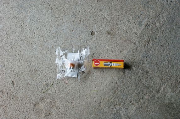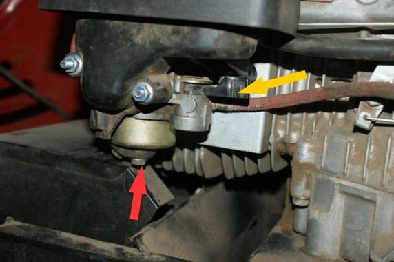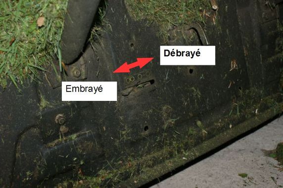 Cela fait 3 fois que la tondeuse autoportée tombe en panne suite à un gicleur bouché. Pour dépanner : 1 Enlever le panier arrière et manoeuvrer le levier dans le sens du débrayage. Il est ensuite possible de déplacer la machine en la poussant. 2 Une fois rentrée dans la grange sur un sol propre, fermer le robinet d'arrivée d'essence (flèche jaune), 3 Démonter le boulon de bas de cuve avec une clé de 10 (flèche rouge). La cuve se détache toute seule. 4 Souffler dans le gicleur (axe central de la cuve), 5 Remonter la cuve sans trop serrer, ouvrir le robinet d'essence, Si le gicleur est débouché cela doit redémarrer. Ne pas oublier de remettre le levier en position embrayée. Une bougie et un filtre à essence neufs ont été approvisionnés.