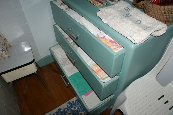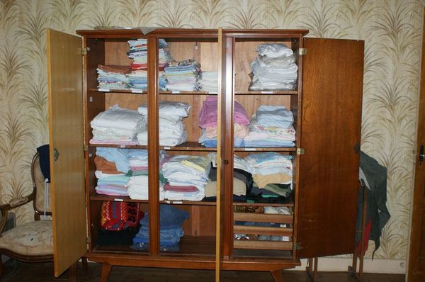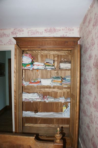 | Dans la grande maison l'armoire de de la chambre à une fenêtre contient les nappes, torchons, essuie-mains et mouchoirs L'armoire de la chambre à trois fenêtres contient toute la literie. Toutes les étagères sont étiquetées. La commode de la salle de bain contient le linge de toilette. |
