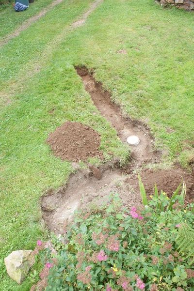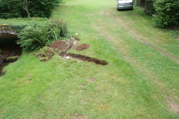 Pour préparer le raccordement à l'assainissement collectif, les eaux pluviales doivent être rejetées directement à la Teyssonne. Les approvisionnements ont été commencés et le trajet de la conduite électrique a été reconnu. A noter que la technique du pot de plastique renversé pour protéger une boîte de dérivation, complètement oubliée depuis l'époque romaine, a été redécouverte à cette occasion. |
