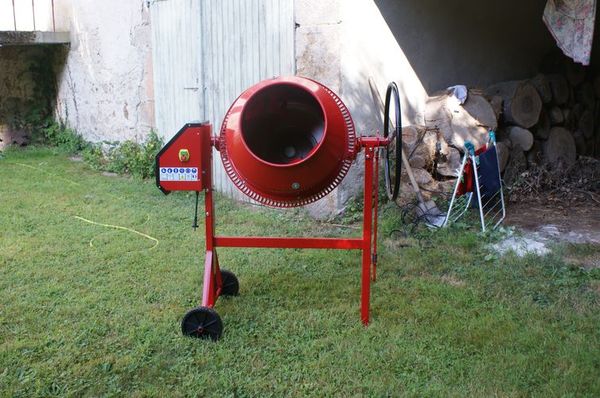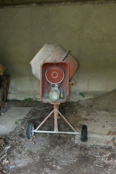 Le moteur de la bétonnière ayant grillé, une remplaçante a été acquise. Pour éviter les dégâts de l'humidité elle ne doit pas être rangée dans le moulin mais dans la grange. |