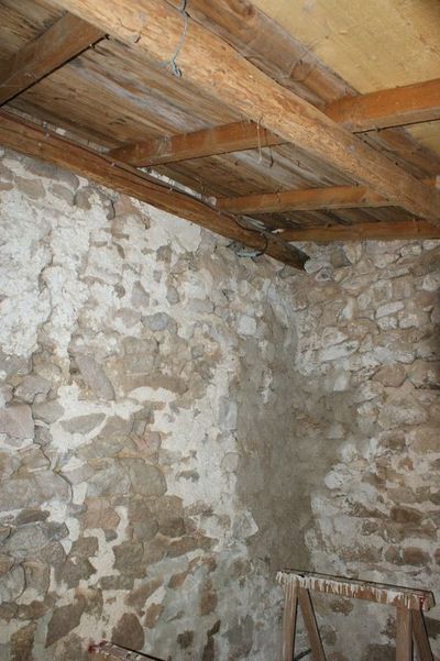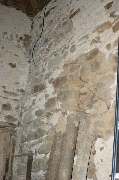 Dans la première salle du moulin, le mur mitoyen avec la réserve à outils est soufflé. Le rejointoiement a été commencé dans la réserve à outil pour stopper le phénomène. |
