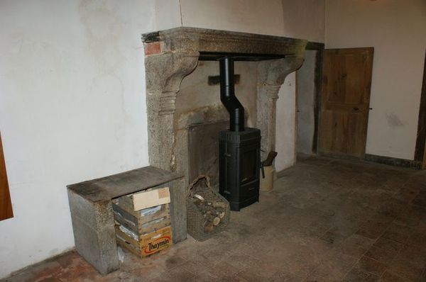 L'obturation de la cheminée de la salle noire a été terminée. Le fond de la cheminée a été crépi à la chaux et le poêle a été remonté. |