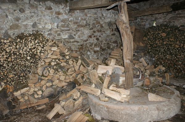 Le tas de bois écroulé fin août le long du mur Sud de la seconde salle du moulin a été relevé. Quelques bûches provenant du frêne abattu dans le béal ont été rentrées. |