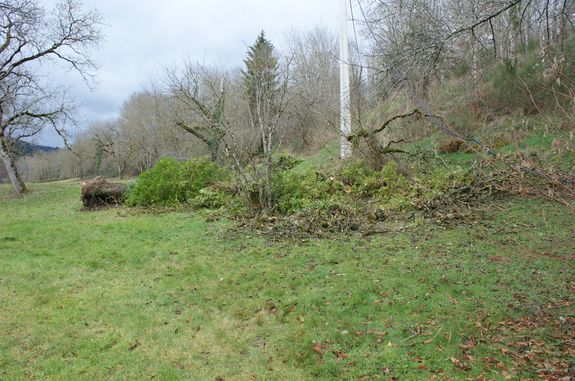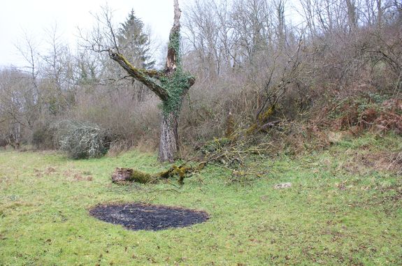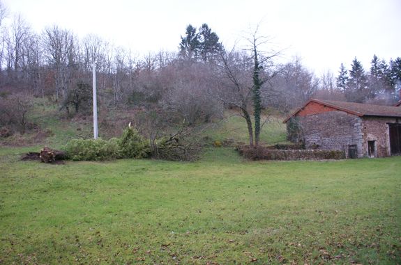 Le gros noyer du fil à linge est tombé le 2 janvier sur les fils électriques alimentant le moulin. La ligne a été arrachée du pignon de la grange mais elle n'est pas abîmée. L'arbre a été arraché entièrement ce qui évitera un travail de dessouchage mais il faudra reboucher le trou. Après intervention des agents d'Enedis le débitage a été commencé. Les branchages entreposés au pied du coteau seront brûlés ultérieurement. Pour l'heure la ligne électrique est à terre mais elle est sous tension. Les agents d'Enédis ont promis de venir réparer mais la tempête du 3 janvier les en a empêchés. Le vieux noyer au pied du côteau à perdu presque toutes ses branches qui devront être dégagées. |