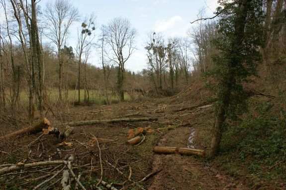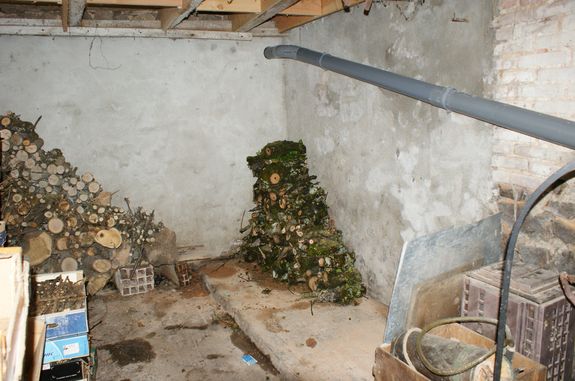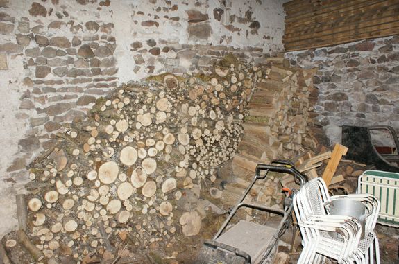| Le bois du noyer est stocké dans la remise. Le bois sec est à prendre en priorité le long du mur Est de la première salle du moulin. Henri Mouillère a commencé l'exploitation des bois près de la vanne. Il doit encore abattre quelques arbres, fendre et enlever le stock.